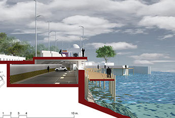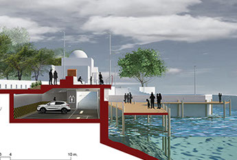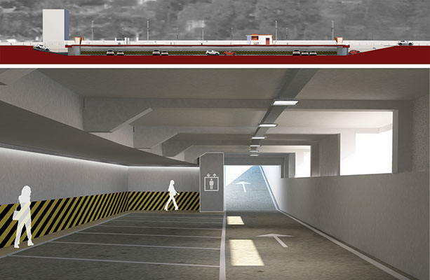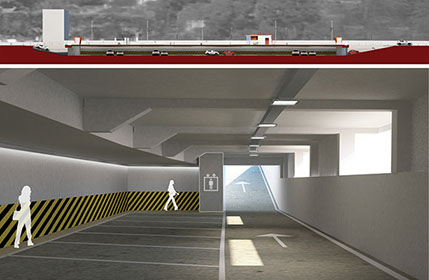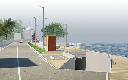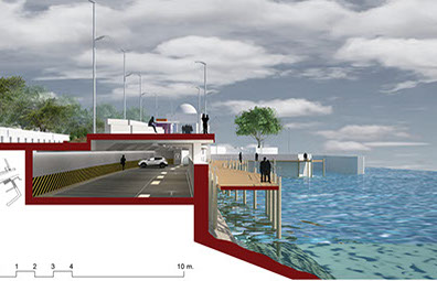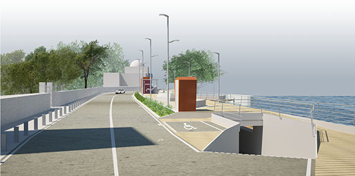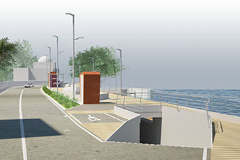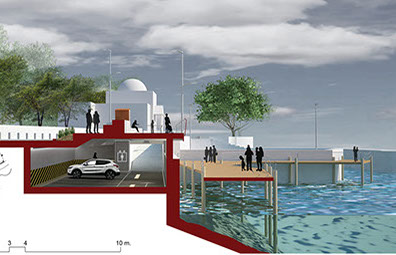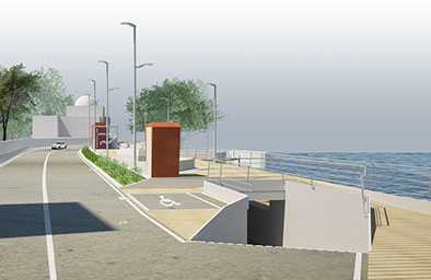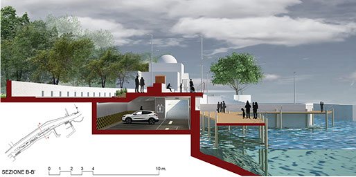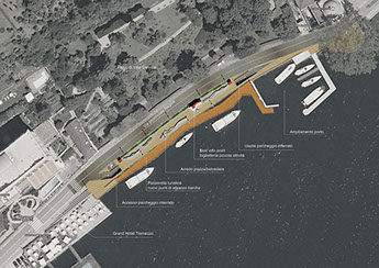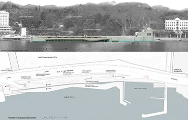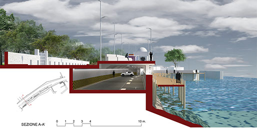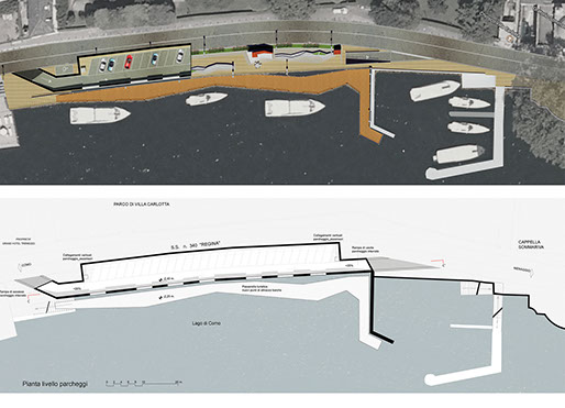 L’idea progettuale nasce dall’analisi dei caratteri semantici del luogo al fine di trovare la migliore soluzione possibile per far si che il nuovo dialoghi con il vecchio, pur differenziandosi da esso, senza alcuna soluzione di continuità apparente. L’idea progettuale propone di collocare l’esistente parcheggio a raso al di sotto dell’attuale quota stradale, accessibile tramite una rampa d’ingresso sul lato del Grand Hotel Tremezzo e una di uscito verso Cappella Sommariva. Alla quota stradale l’intervento, se lo dividessimo idealmente secondo il suo asse NE-SO, in parte, verso Nord, tornerà ed essere viabilità, riconnettendosi alla stessa, mentre per l’altra, Sud, per questioni di sicurezza, ci si alza di quota a +0,40m rispetto al livello strada, dando vita così alla nuova sistemazione “piazzetta- lungolago” e belvedere. Lo spazio pubblico è costituito da percorrenze intervallate da sistemi di arredo/sedute volti a valorizzare e meglio apprezzare le peculiarità del luogo, inoltre è stato posizionato un elemento/box (15 mq) al quale potrà essere assegnata qualsiasi funzione l’amministrazione comunale ritenga opportuna (piccola attività, biglietteria, info-point, ecc.). Un ulteriore elemento caratterizzante il progetto è la passerella turistica che partendo da quella esistente si dirama lungo tutta l’area d’intervento proponendo ai possibili visitatori un approccio unico con il paesaggio circostante.